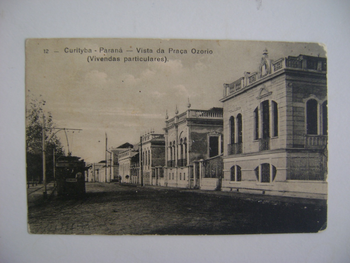 Cartão Postal Curitiba, PR. Vista da Praça Ozório, Vivendas particulares, Bonde. Ed. J. Cardoso Rocha, n. 12