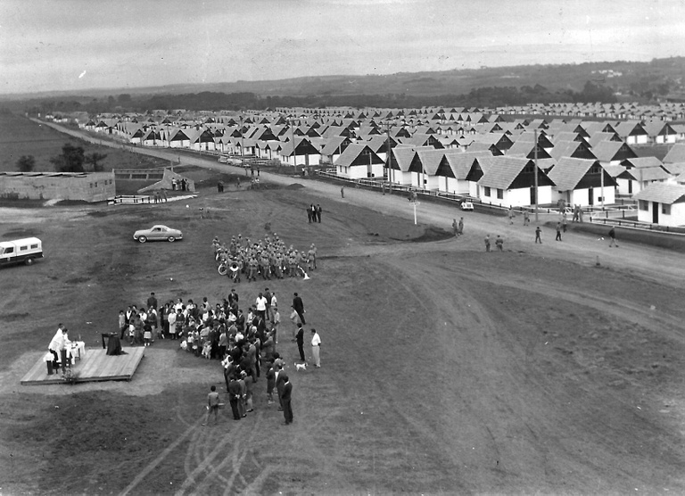 A inauguração da Vila reuniu, além do prefeito Ivo Arzua e do governador Paulo Pimentel, o presidente Castelo Branco e uma comitiva de militares. (Foto: Acervo Casa da Memória)