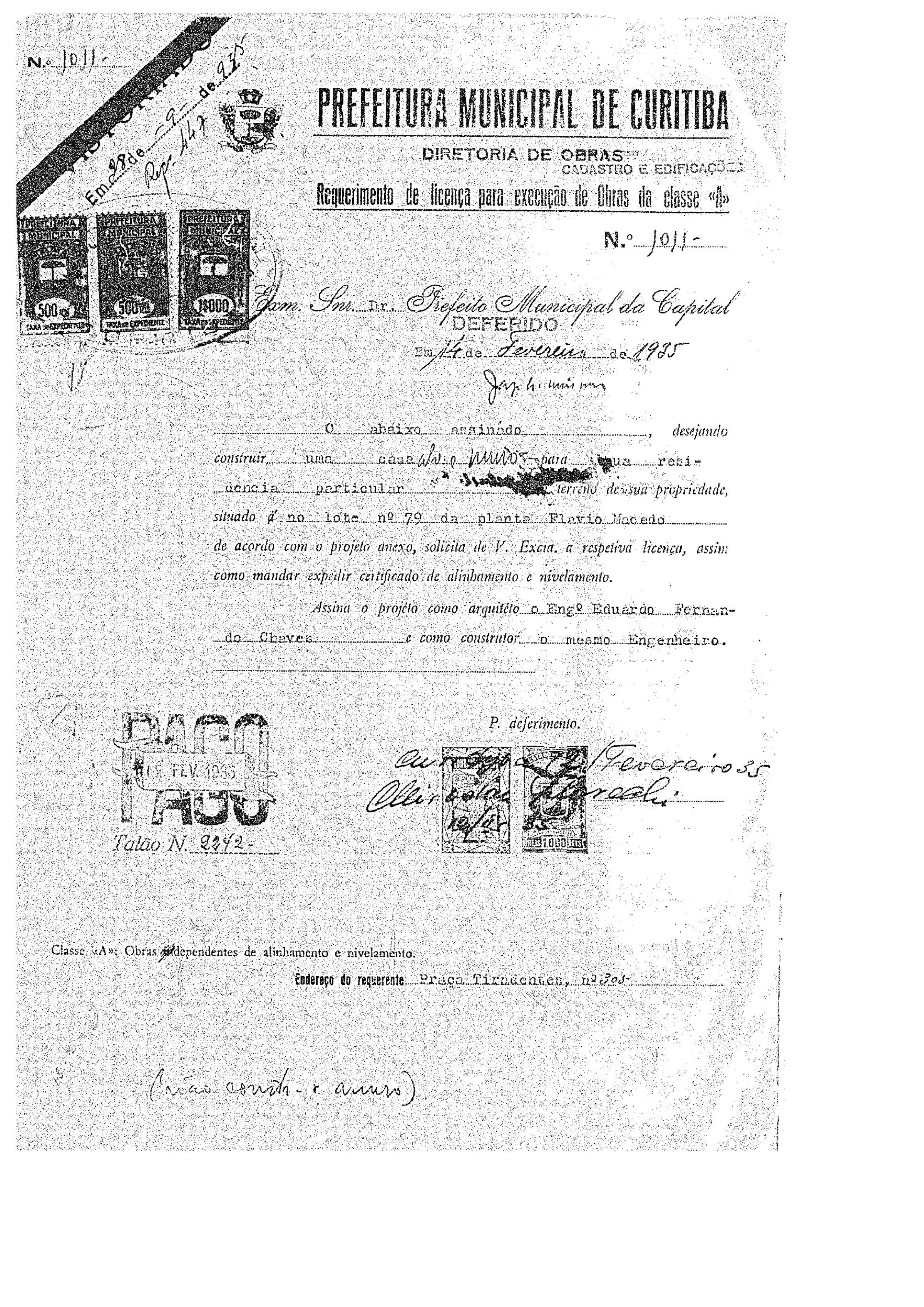 O Alvará de Construção, registrado sob o Talão nº 119, nº 147/1929, confirma que a obra foi legalizada junto à Prefeitura de Curitiba, demonstrando que até as residências mais simples estavam sujeitas a normas urbanísticas — um sinal do esforço da cidade em organizar seu crescimento acelerado.