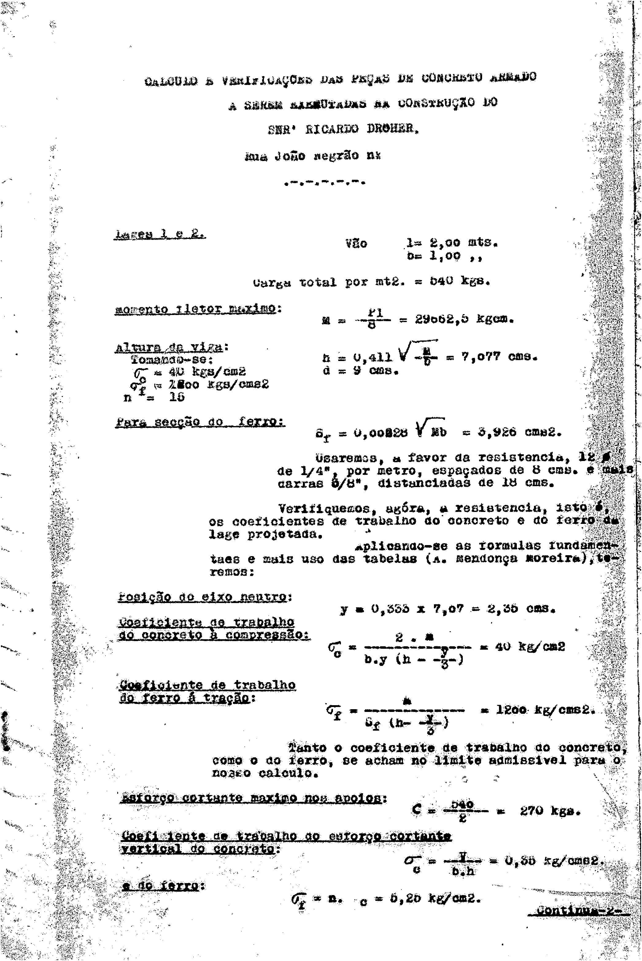 - Memória de cálculo estrutural em concreto armado — um documento raro para residências da época, que demonstra profissionalismo incomum entre construtores locais.