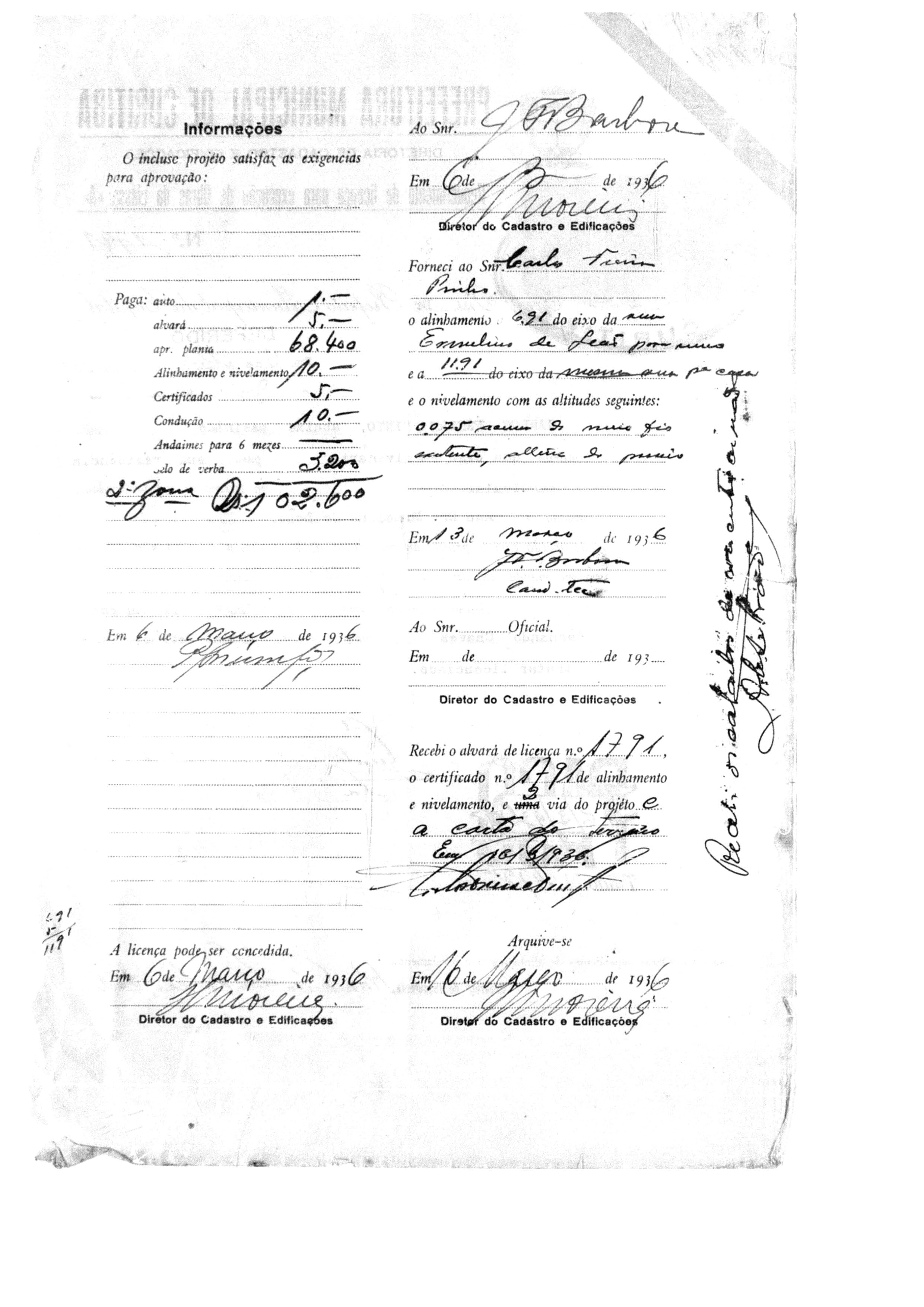 - Alvará de Construção nº 1791/1936. Acervo: Arquivo Público Municipal de Curitiba; Prefeitura Municipal de Curitiba.