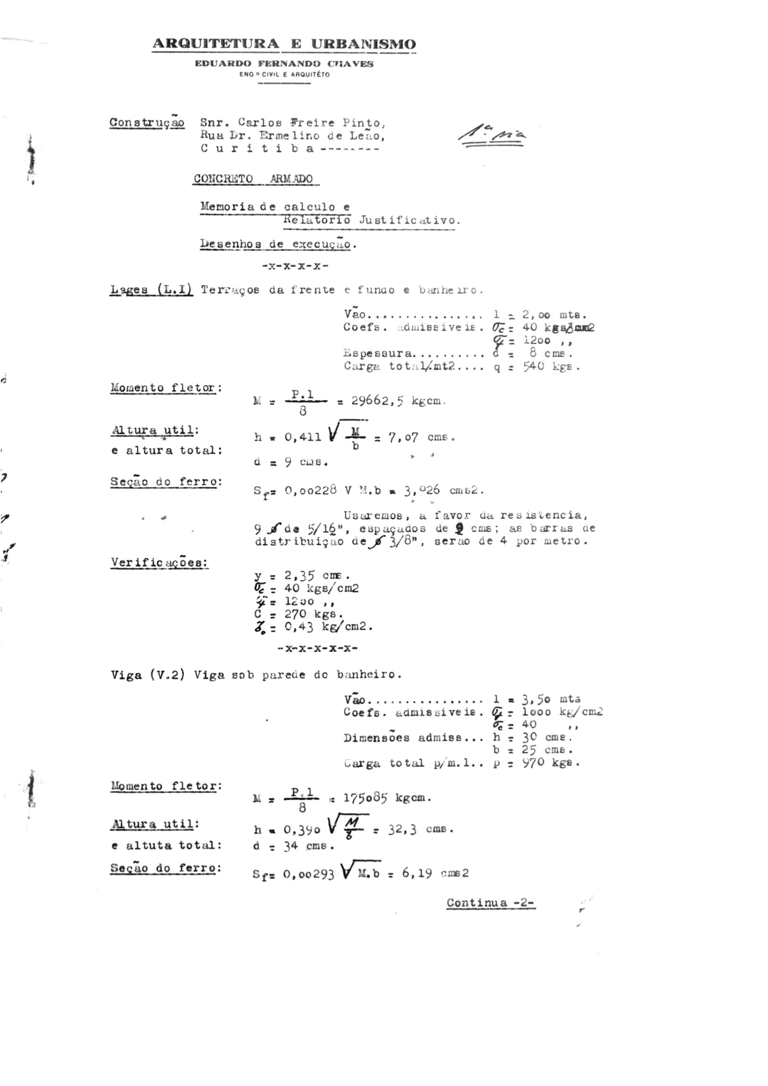 Em meio aos arquivos empoeirados e microfilmes digitalizados do Arquivo Público Municipal de Curitiba, repousa um testemunho silencioso de uma Curitiba em transição: o projeto da Residência para o Senhor Carlos Freire Pinto, assinado pelo arquiteto Eduardo Fernando Chaves em 6 de março de 1936. Embora a edificação não tenha sido localizada em levantamentos realizados até 2012 — sugerindo sua possível demolição, transformação irreconhecível ou desaparecimento urbano —, seu legado documental permanece como um elo precioso com a arquitetura residencial do entre-guerras no Paraná.