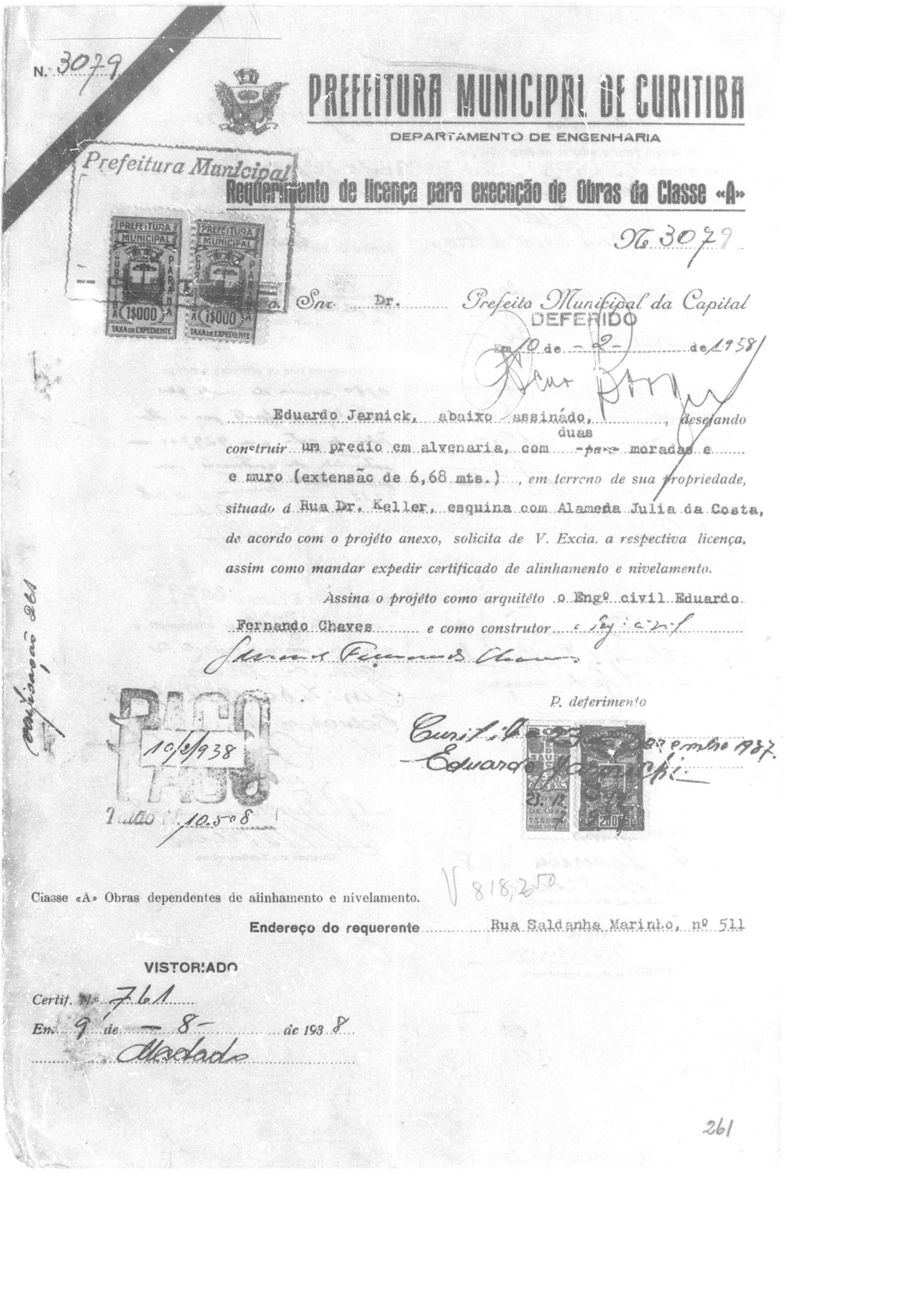 Projetada em 10 de fevereiro de 1938 pelo escritório Gastão Chaves & Cia., a obra foi originalmente concebida como residência geminada para o senhor Eduardo Jarnick, um nome que, embora não tenha ecoado nos grandes anais da história curitibana, representa a classe média urbana que impulsionou o desenvolvimento residencial da capital paranaense nas primeiras décadas do século XX.