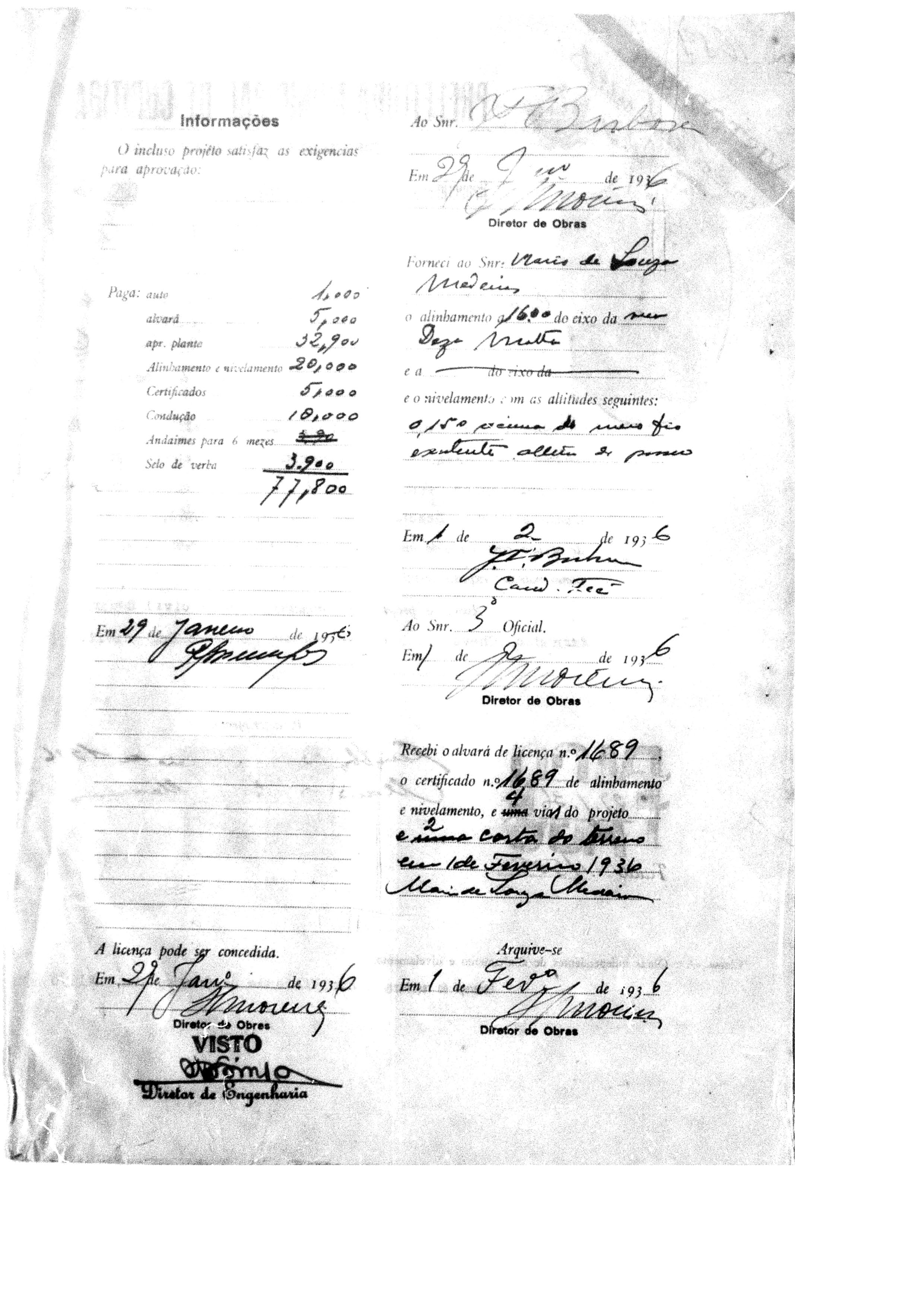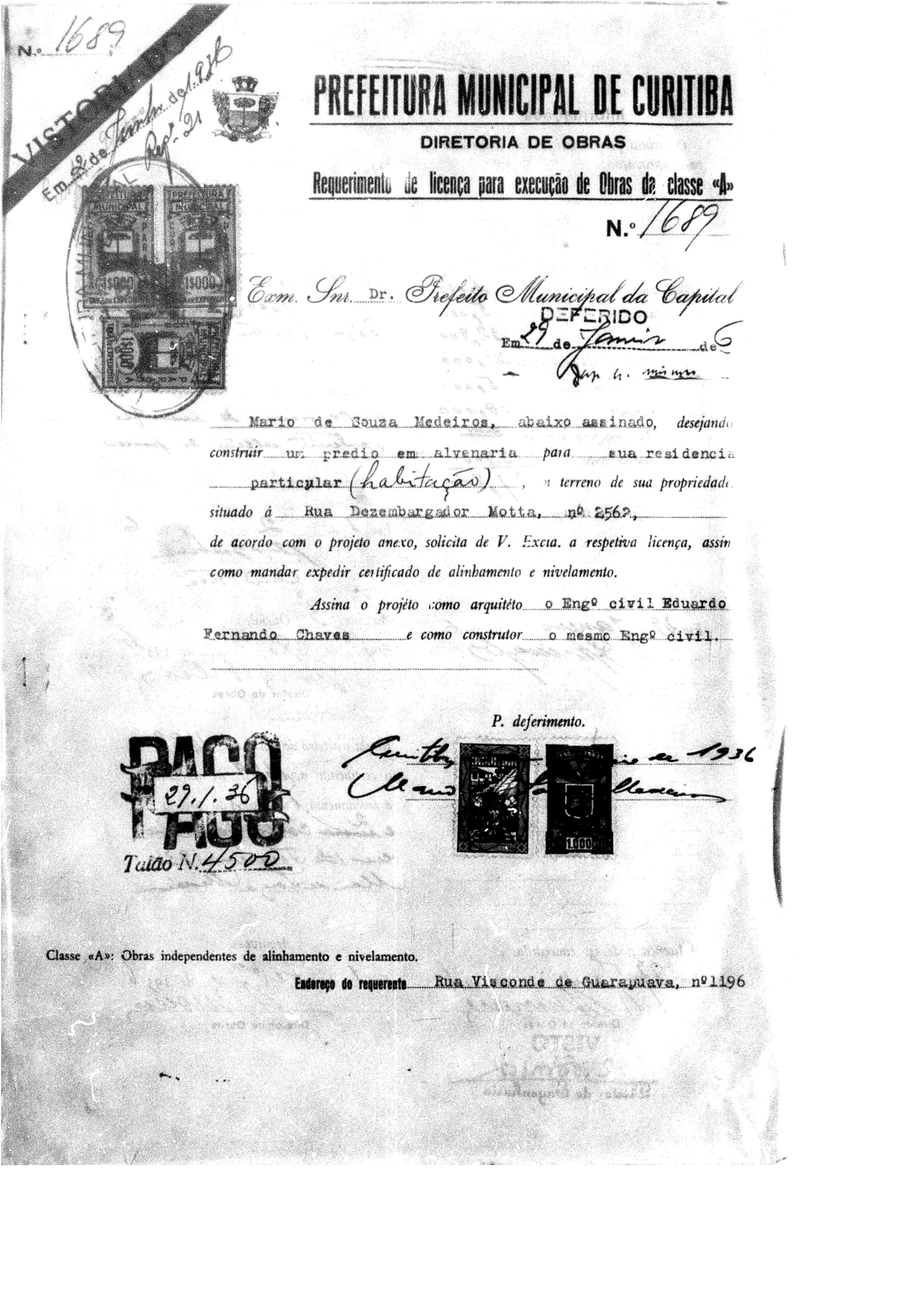 O Alvará de Construção nº 1689/1936, emitido pela Prefeitura Municipal de Curitiba, formalizou a obra perante as normas urbanísticas vigentes. A documentação preservada no Arquivo Público Municipal de Curitiba inclui: