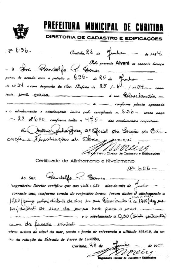 Em 25 de junho de 1934, em meio a uma Curitiba que se modernizava com bondes, novos bairros e aspirações urbanas, foi assinado um projeto arquitetônico que sintetizava o espírito de uma era: o bungalow de alvenaria de tijolos destinado ao senhor Randolpho Pereira Gomes, na Rua Clevelândia. A assinatura por trás do traço era a de Eduardo Fernando Chaves, arquiteto e construtor cuja atuação marcou profundamente a paisagem residencial da capital paranaense nas primeiras décadas do século XX.