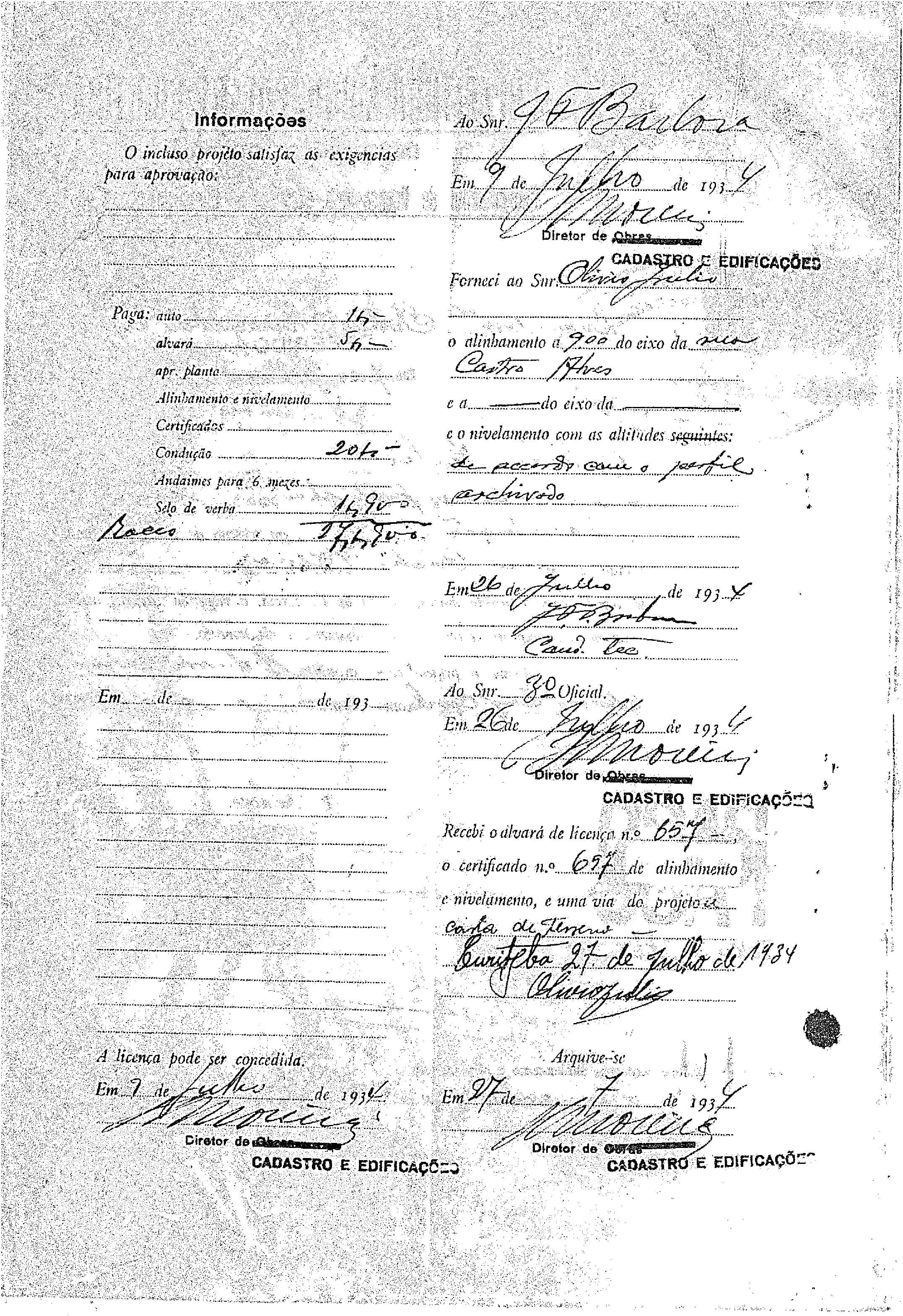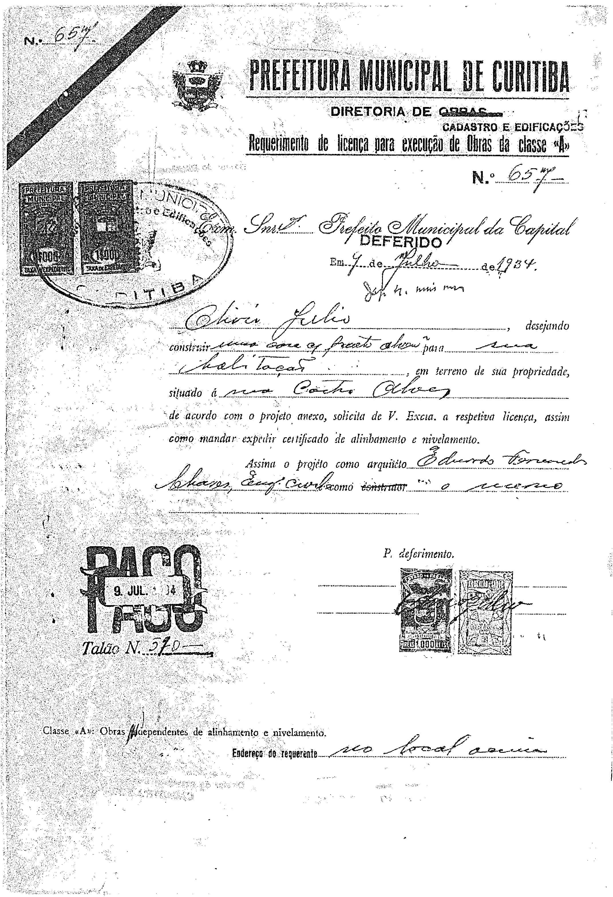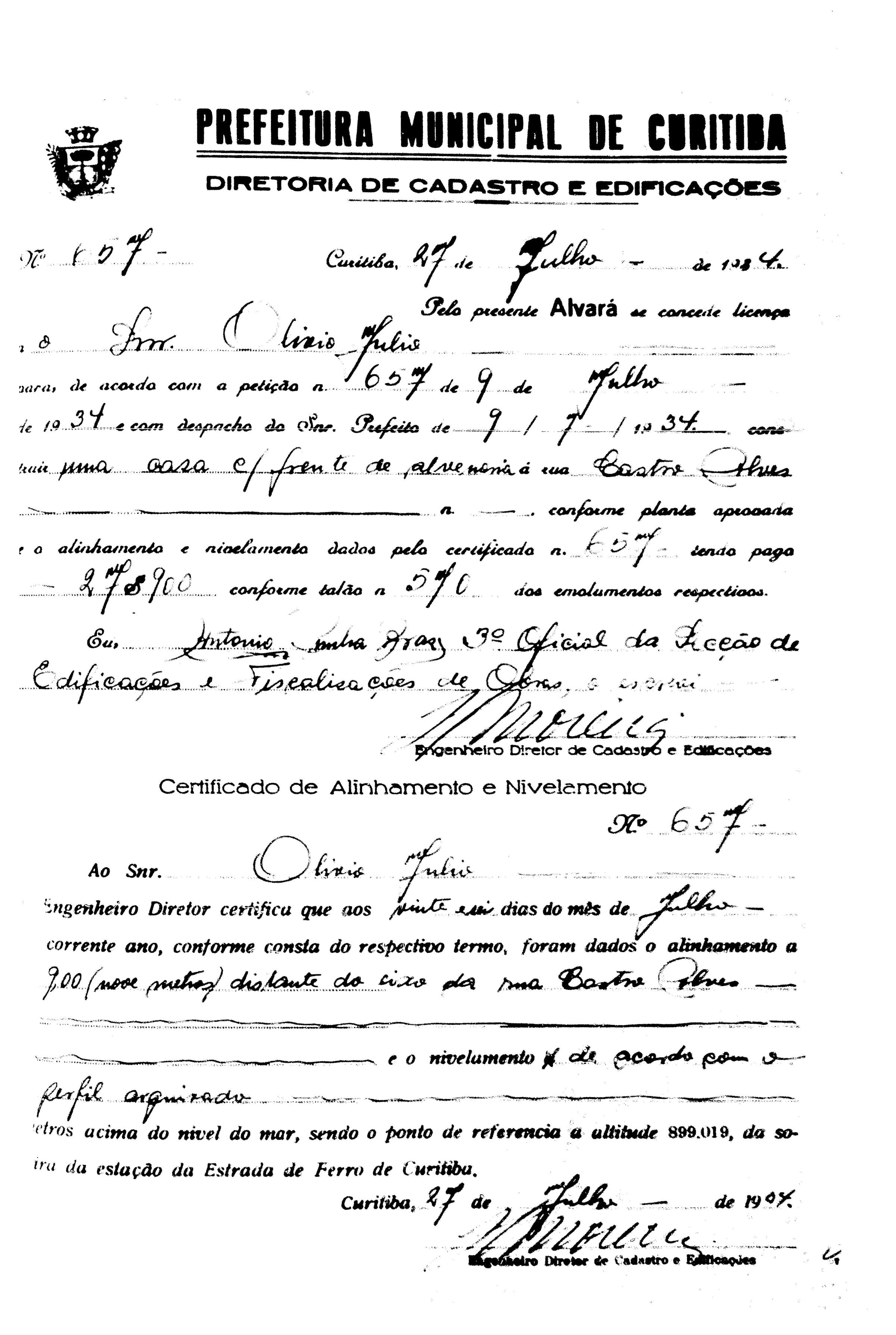 O Alvará de Construção nº 657/1934, emitido poucos dias após o projeto, atesta que a obra foi aprovada e fiscalizada, integrando-se plenamente ao ordenamento urbano de Curitiba.