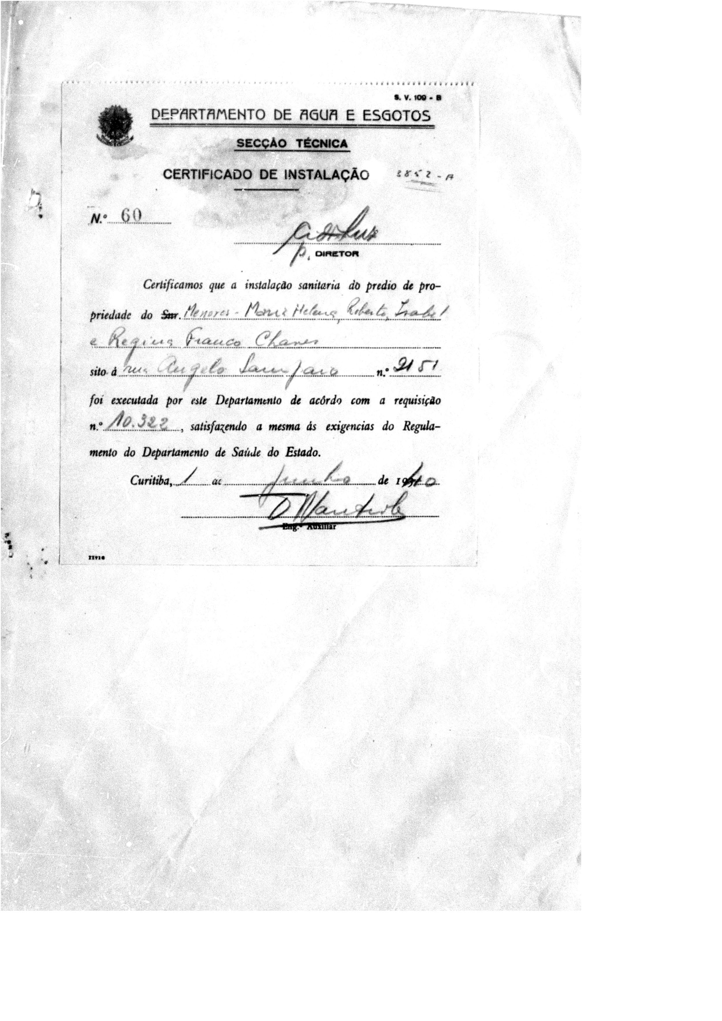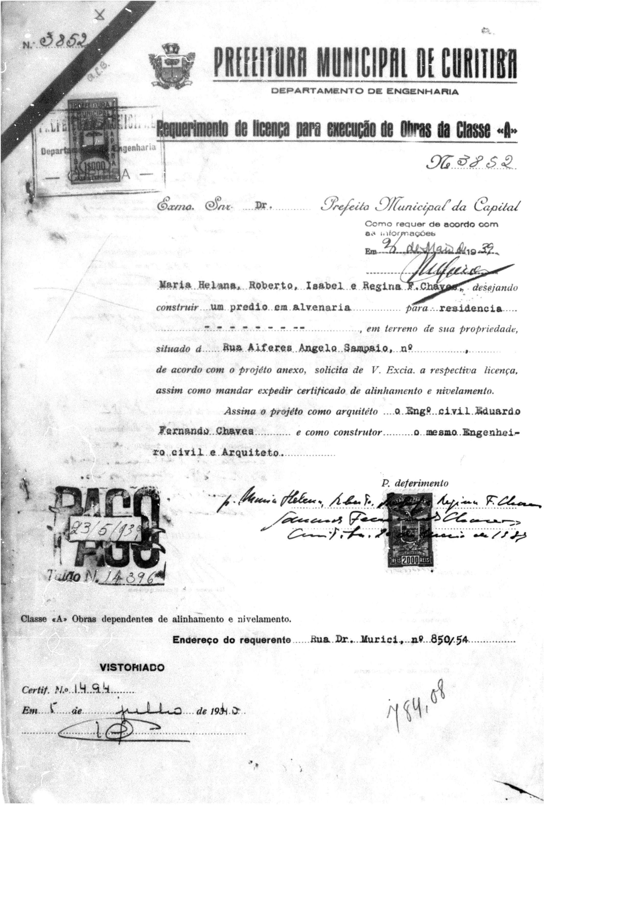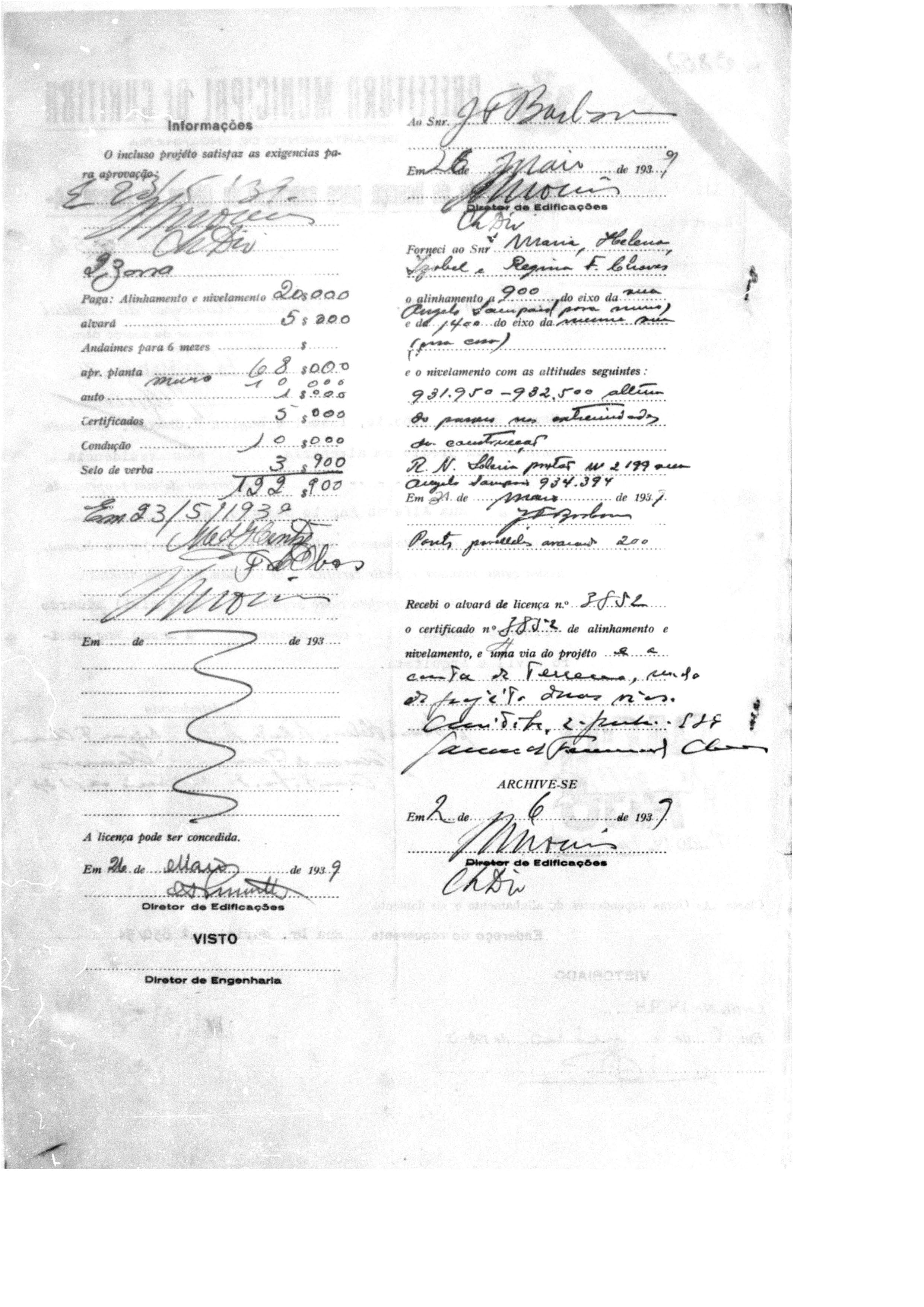 - Alvará de construção: nº 3852/1939 (embora uma referência mencione o nº 2767, o documento oficial vinculado ao projeto é o 3852)