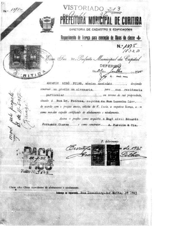Em 1935, foi emitido o Alvará de Construção nº 1375, documento oficial que autorizava a edificação. Esse alvará — hoje arquivado na Prefeitura Municipal de Curitiba — é mais do que um papel burocrático. É a validação institucional de um sonho privado. É o momento em que o Estado reconhece que aquele espaço será, sim, um lar — e que ele deve seguir normas, padrões, limites.
