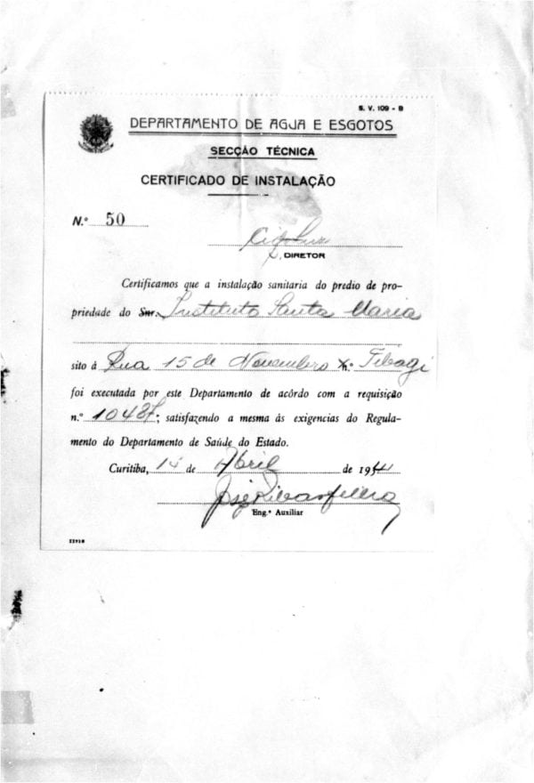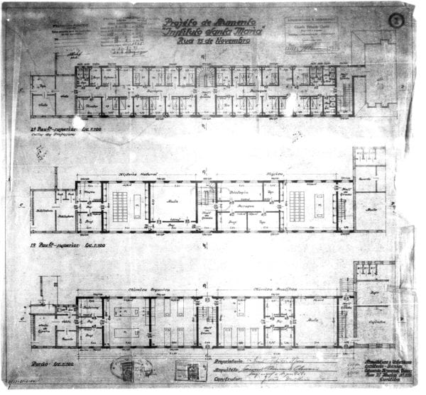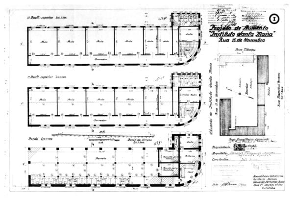 3, 4, 5 e 6 – CHAVES, Eduardo Fernando. Projéto de Aumento. “Instituto Santa Maria”. Rua XV de Novembro. Alvará 2950. Planta dos pavimentos térreo e superior, fachada voltada para a Rua Tibagi e implantação; plantas da capela e porão e fachada voltada para a Rua Conselheiro Laurindo; planta com corte longitudinal e planta com corte C – D, representados em quatro pranchas. Microfilme digitalizado.