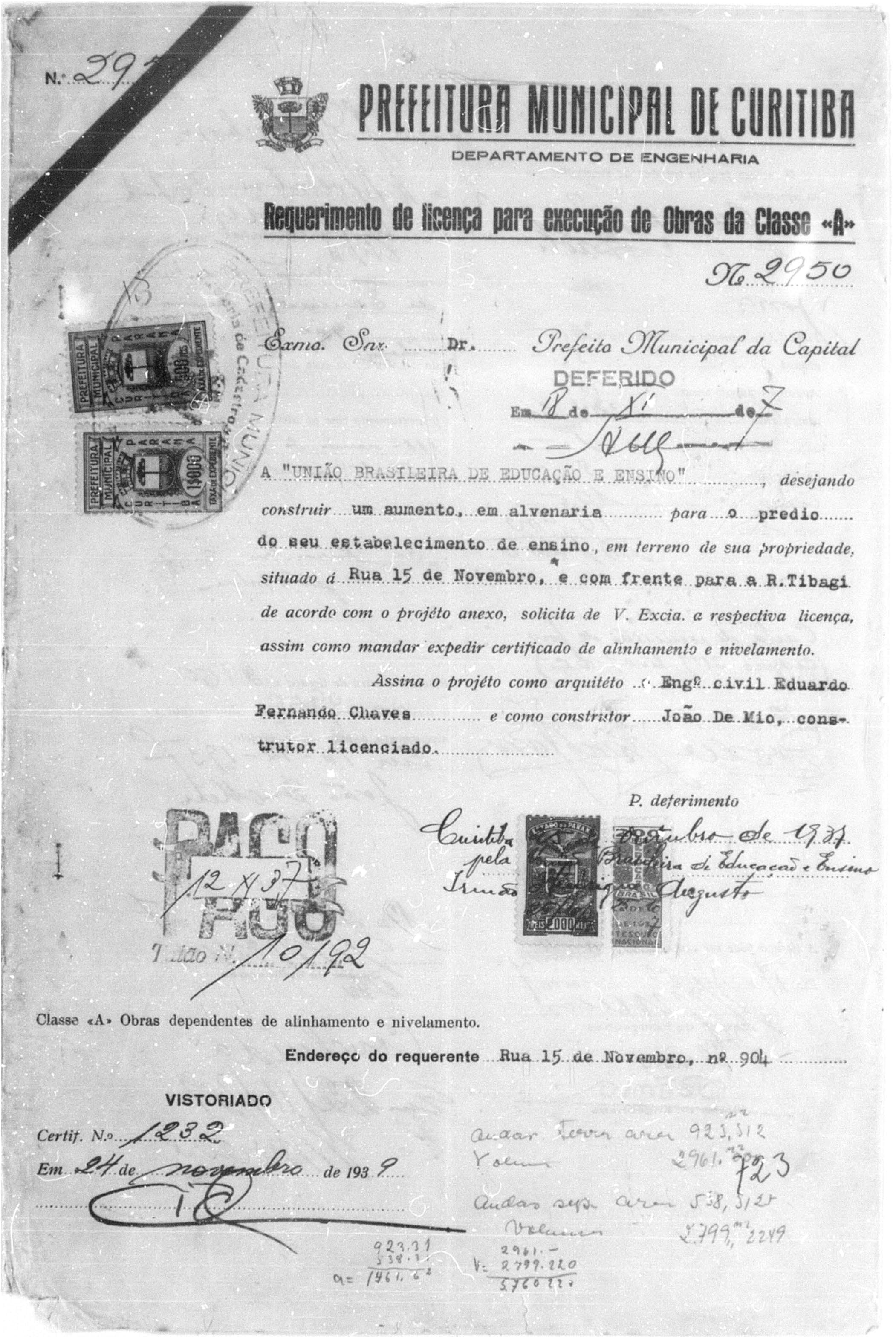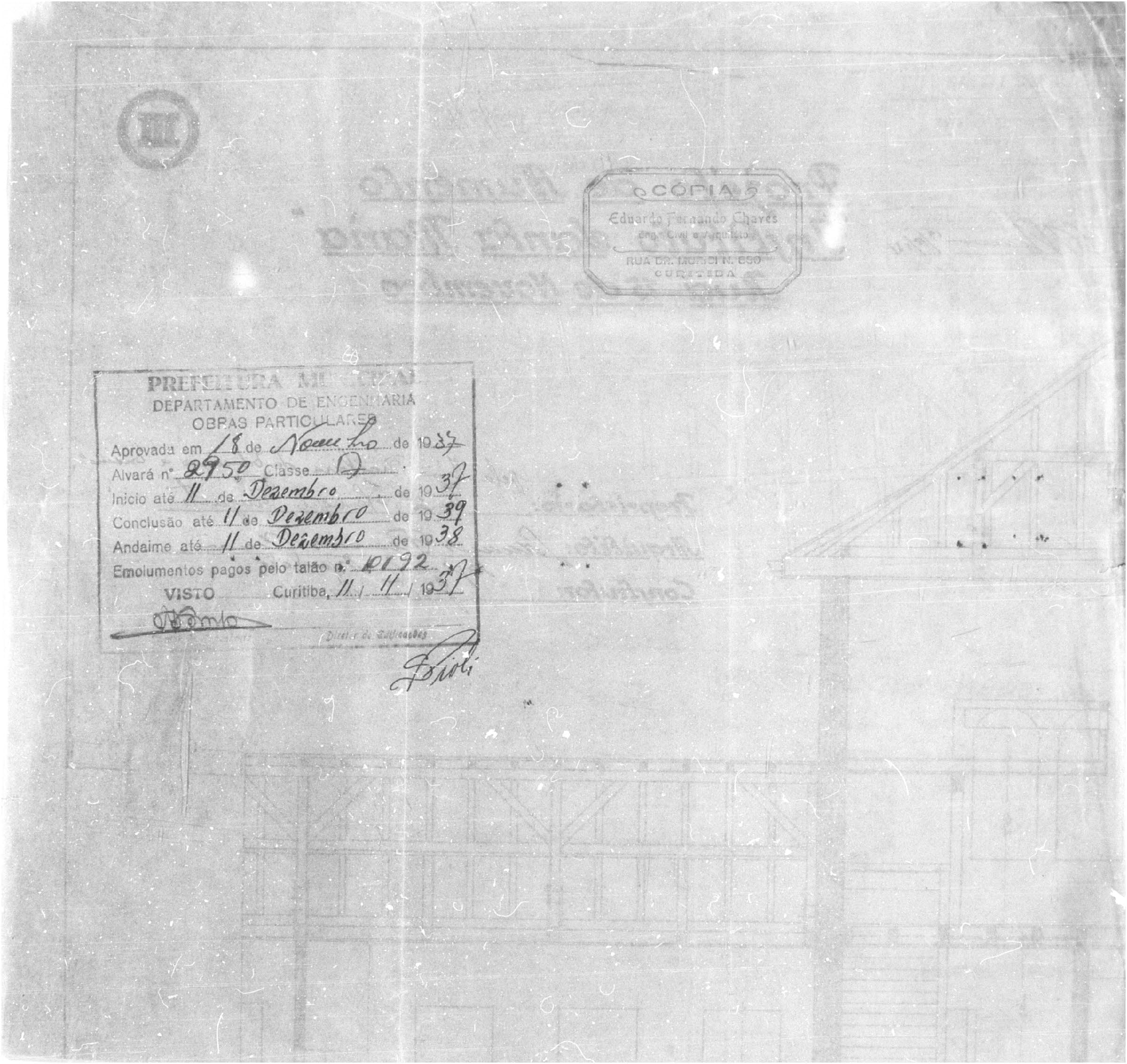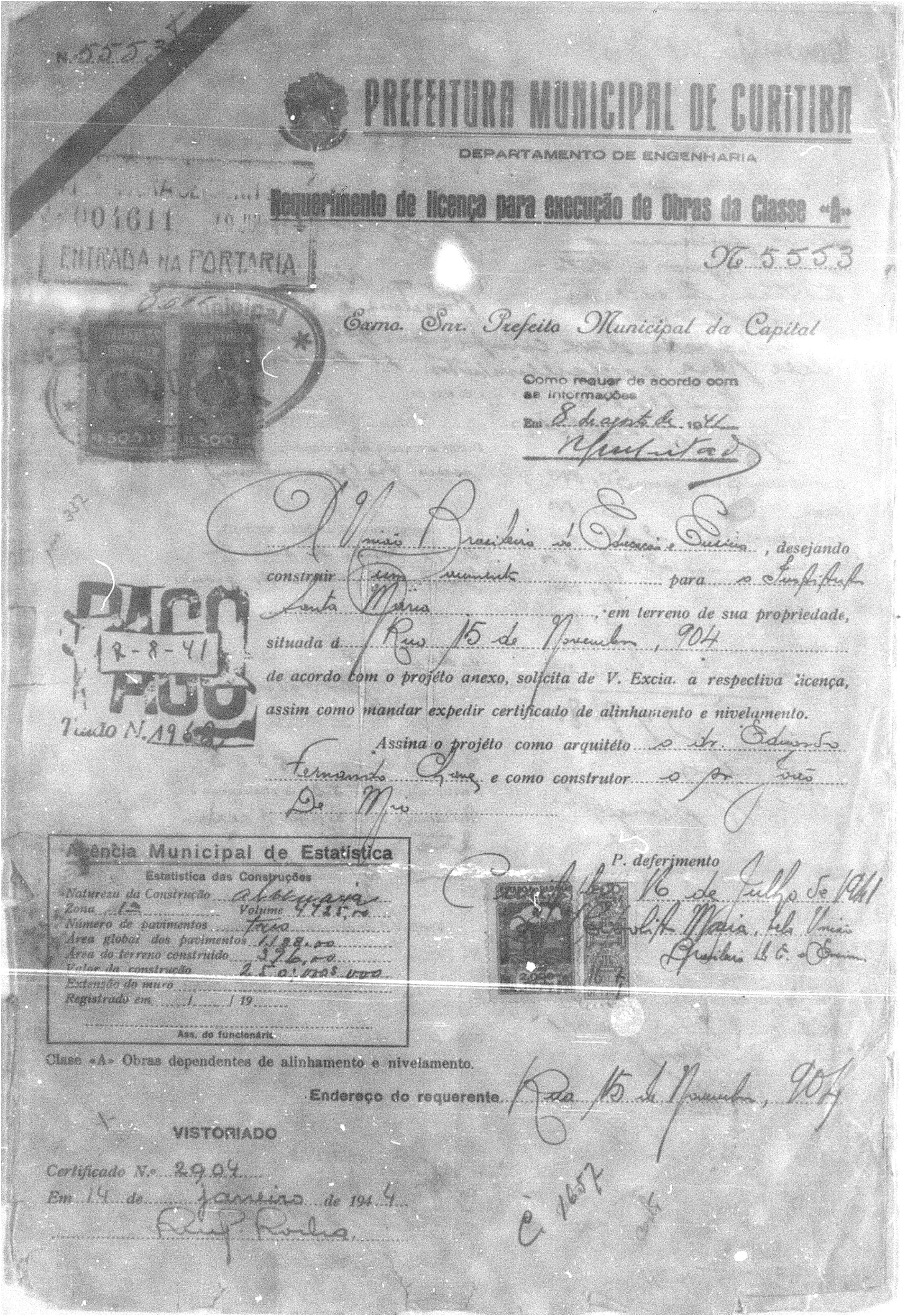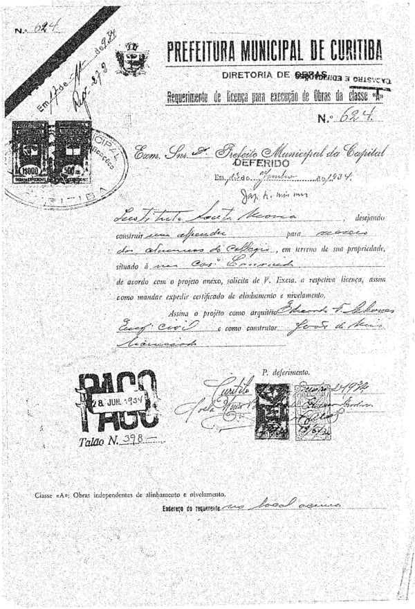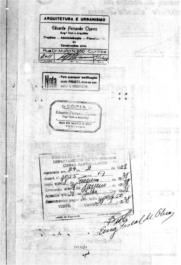- Alvará nº 5553/1941: refinamento da fachada principal, voltada para a Rua XV de Novembro, com cortes técnicos e implantação atualizada.