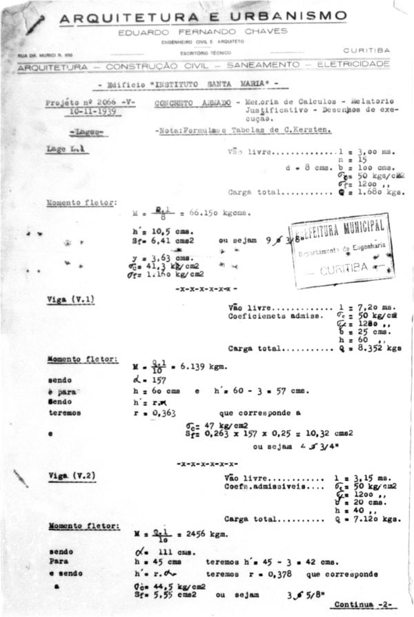 10, 11, 12, 13, e 14 - CHAVES, Eduardo Fernando. Projéto para Aumento do Prédio do Instituto Santa Maria. Rua XV de Novembro. Alvará nº 4279. Planta do corte C-D; plantas do porão, 1º e 2º pavimentos e implantação; fachada voltada para a Rua Tibagi; planta das vigas e estribos em concreto armado; fachada voltada para a Rua XV de Novembro e corte A-B, representados em cinco pranchas. Microfilme digitalizado.