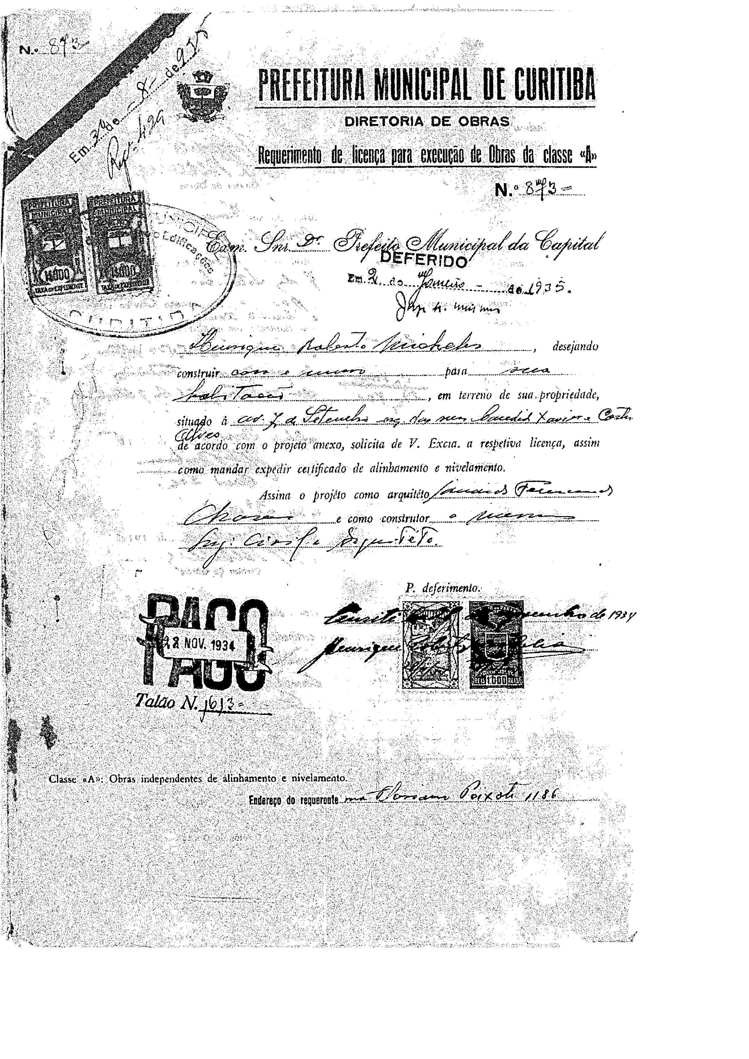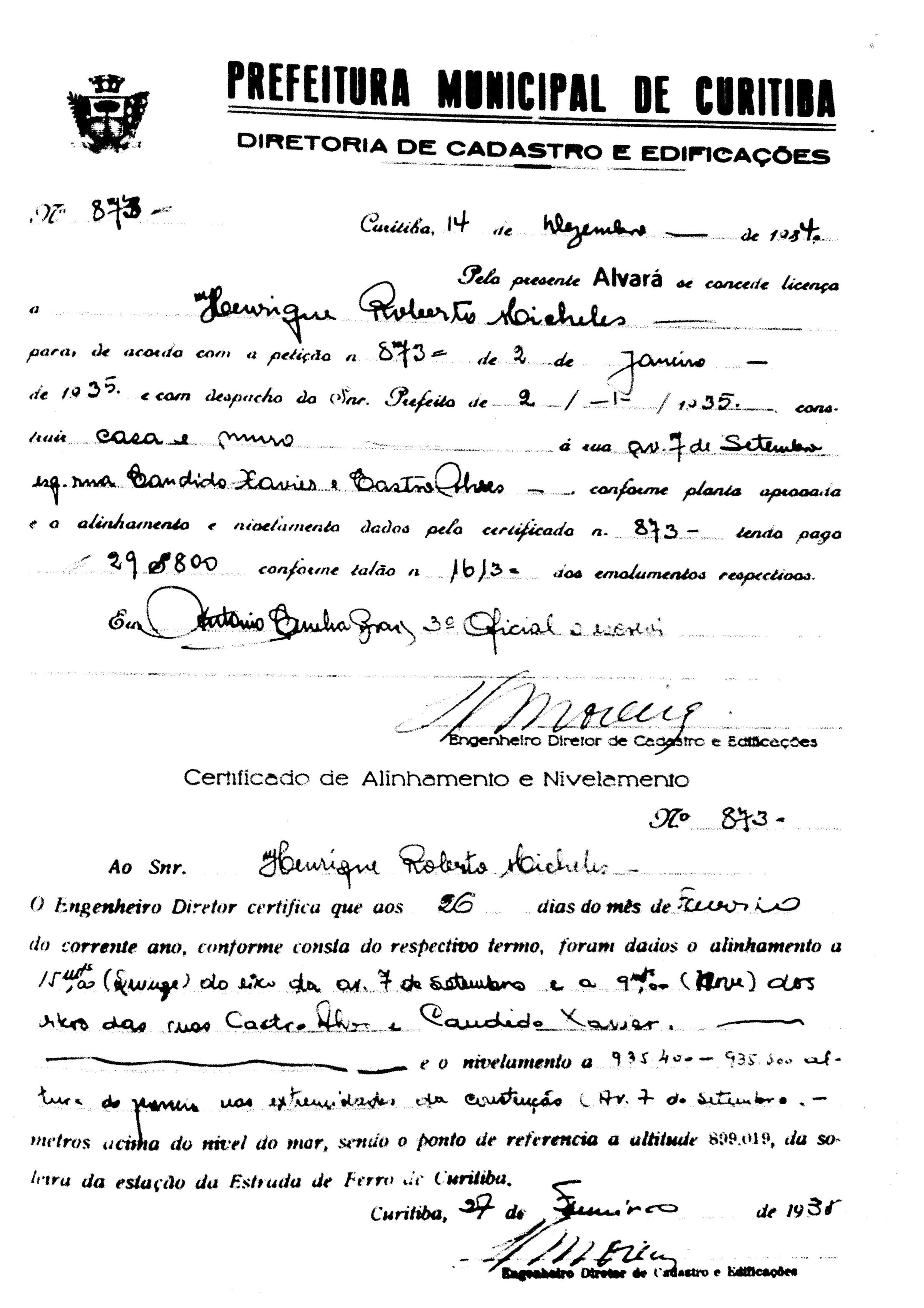 O Alvará de Construção nº 941/1935, emitido pela Prefeitura de Curitiba, confirma a legalidade da empreitada e a conformidade com as normas urbanísticas da época — um testemunho de como a cidade, mesmo em expansão acelerada, ainda exigia ordem e planejamento, mesmo nas moradias mais simples.